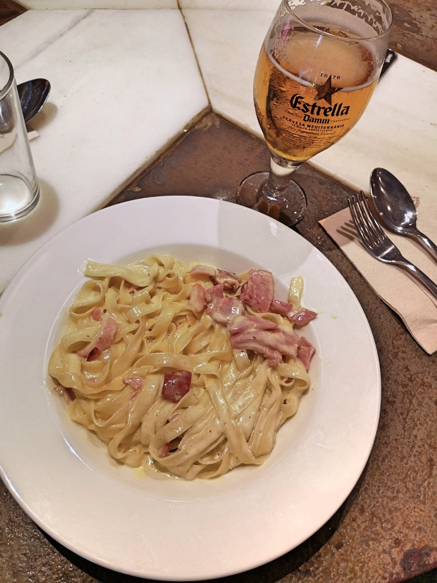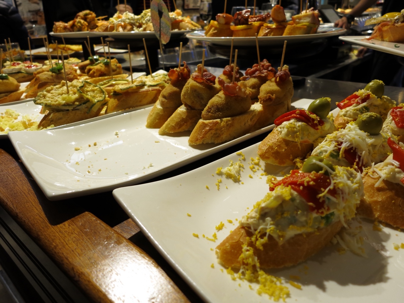 След толкова обиколки се огладнява бързо. Връщаме се в квартала Poble-Sec за бърза смяна на аутфита и небрежна похапка в тапас баровете по Carred del Blai. В рамките на 300 метра има поне една дузина от тях. Новият хит, с който се сблъскахме (нов за нас, не за каталунци), са така наречените pinchos. Пинчос (от испанското “pinchar” – бода) са хапчици с всевъзможни мезенца – хляб, сирена, меса, морски дарове, маслинки, пастети и дори испански омлет – забодени с различни по вид клечки. Симпатичното на този тип замезване е начинът, по който протича консумацията. Минавате с една чиния покрай отрупания с хапки бар, пълните я по ваш избор, сядате на раздумка, похапвате. След това привиквате сервитьора, който пристига и започва да брои клечките в чинията ви. Така прави сметката – според броя и цвета им. Забавно, а? Хайде сега по една картофена тортия.