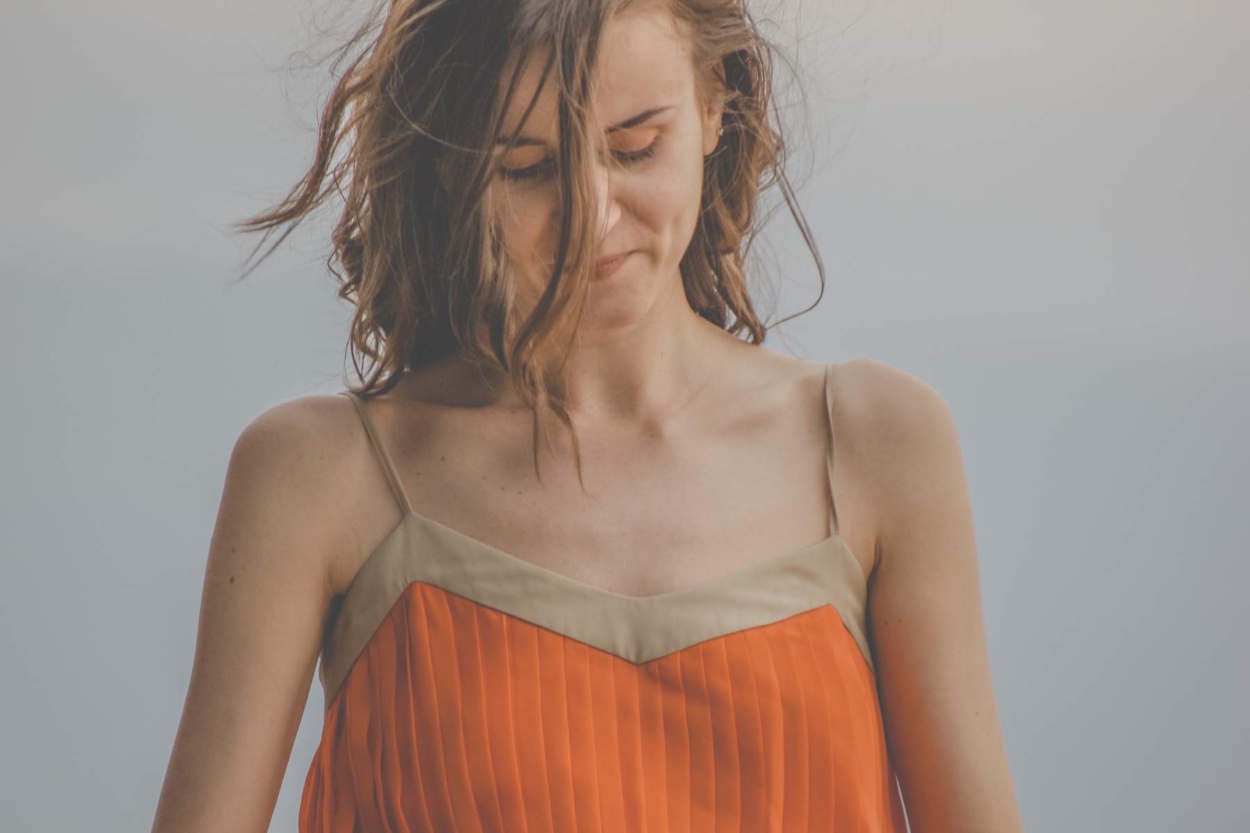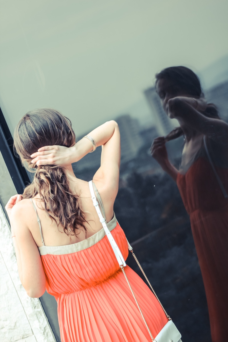 Плисираната коралова рокля дава допълнителен boost за действие, движение и динамика. Цветът е ярък, поглъщаш и излъчващ – абсолютен опонент на студената безжизненост и скучноватост, с която битието понякога опитва да ни обгърне.