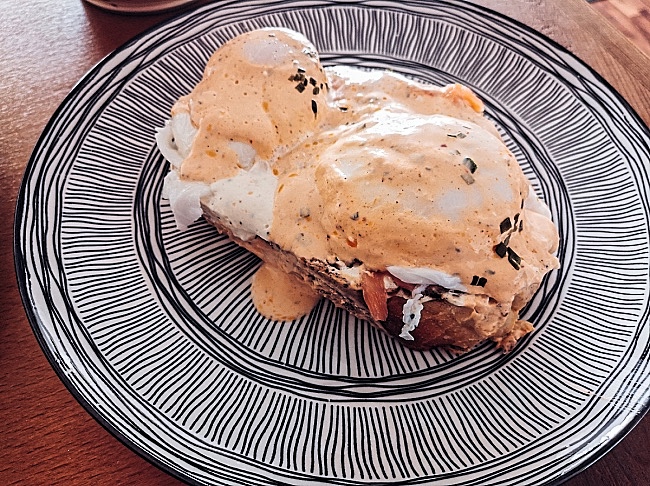 > сандвич с поширани яйца с крема сирене, сьомга и йогурт къри сос