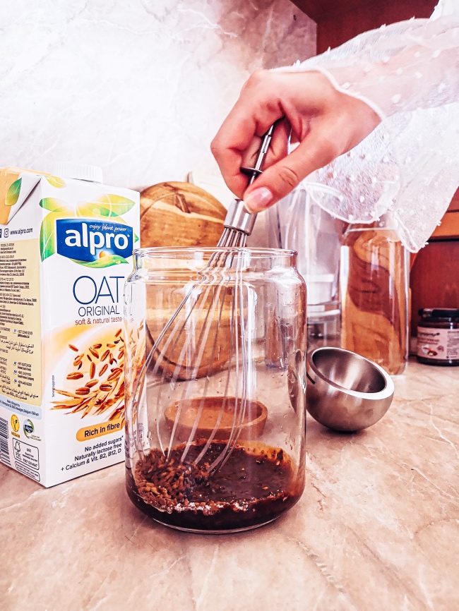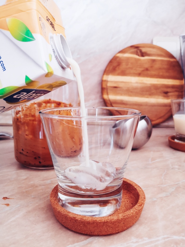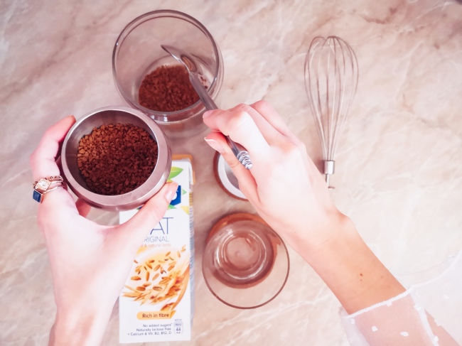 За моето студено лате “далгона” използвах овесено мляко. Използвах също и миксер, защото все още не съм станала Лили-Хълк заради много упражнения у дома и ме заболя ръката след втората минута с бъркалката.